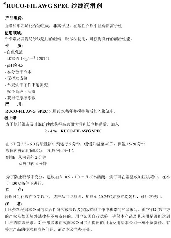 RUCOGEN FWK Refining DetergentProduct Components: Alcohol Ester Compounds, Non-IonicPriority Usage Areas: Suitable for low-foaming cleaning and penetrants of various fibers, with excellent dispersion,RUCO-STAB LGA
